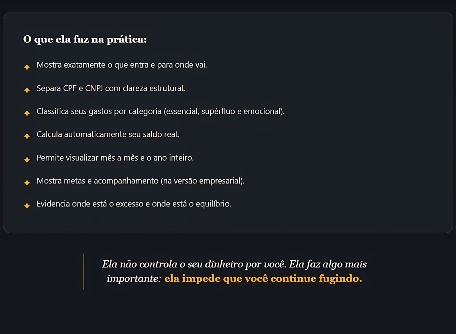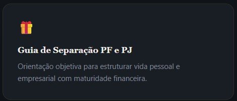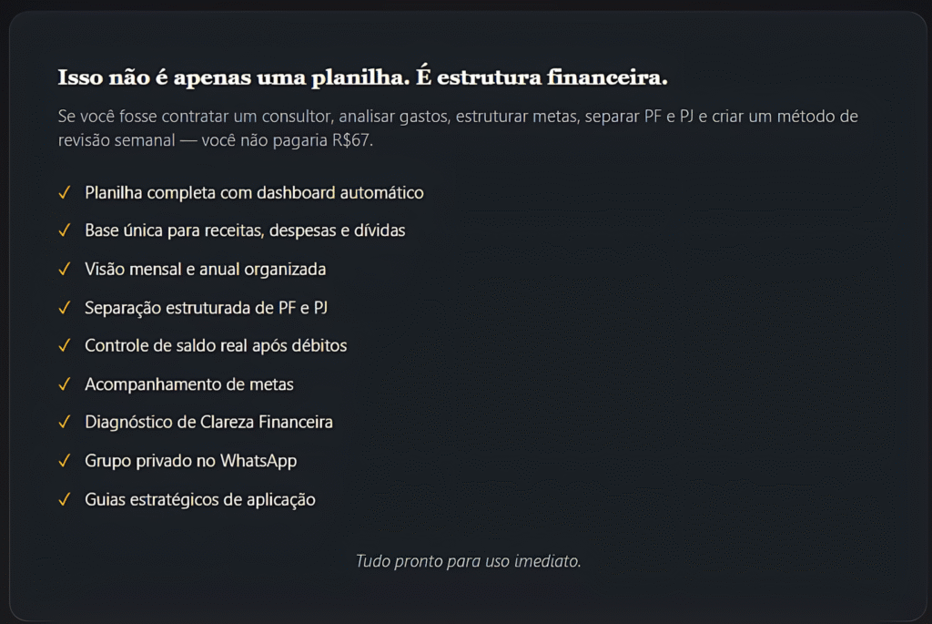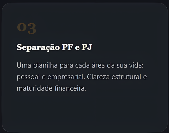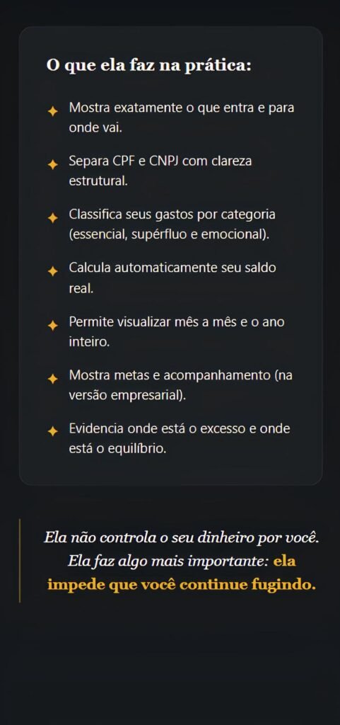 Ela possui estrutura para organizar tanto finanças pessoais quanto empresariais, incluindo separação clara entre PF e PJ.